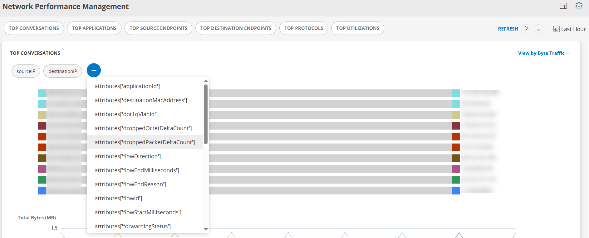 In addition to the standard 5-tuple attributes (source IP, destination IP, source port, destination port, and protocol), you can now filter using any general field supported by IANA, such as flowDirection, classId, samplerId, and other attributes defined in your custom template.