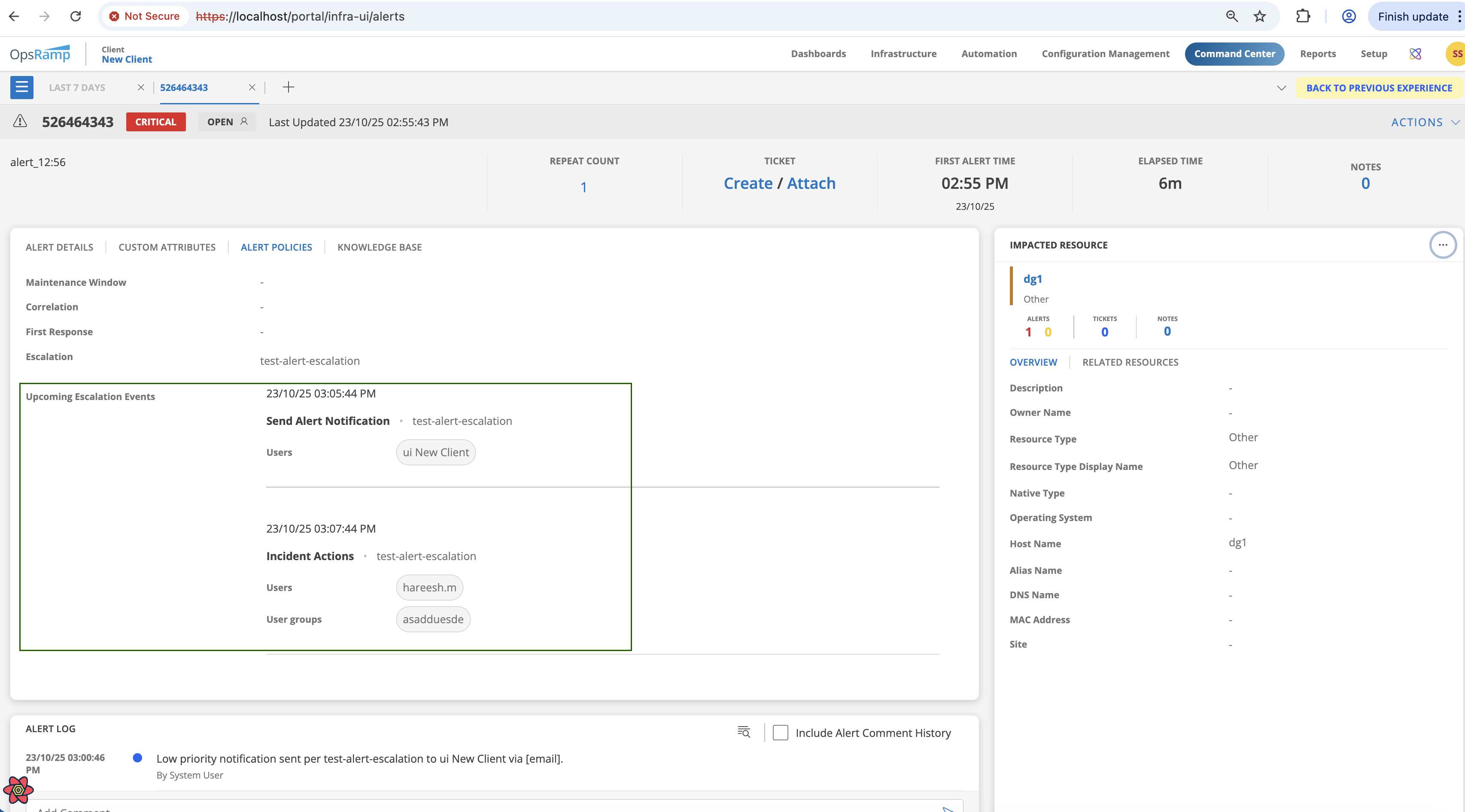 Once the Notification Rule is created, whenever an alert matches the escalation policy that includes these rules, the Alert Details page displays an Upcoming Escalation Events section.